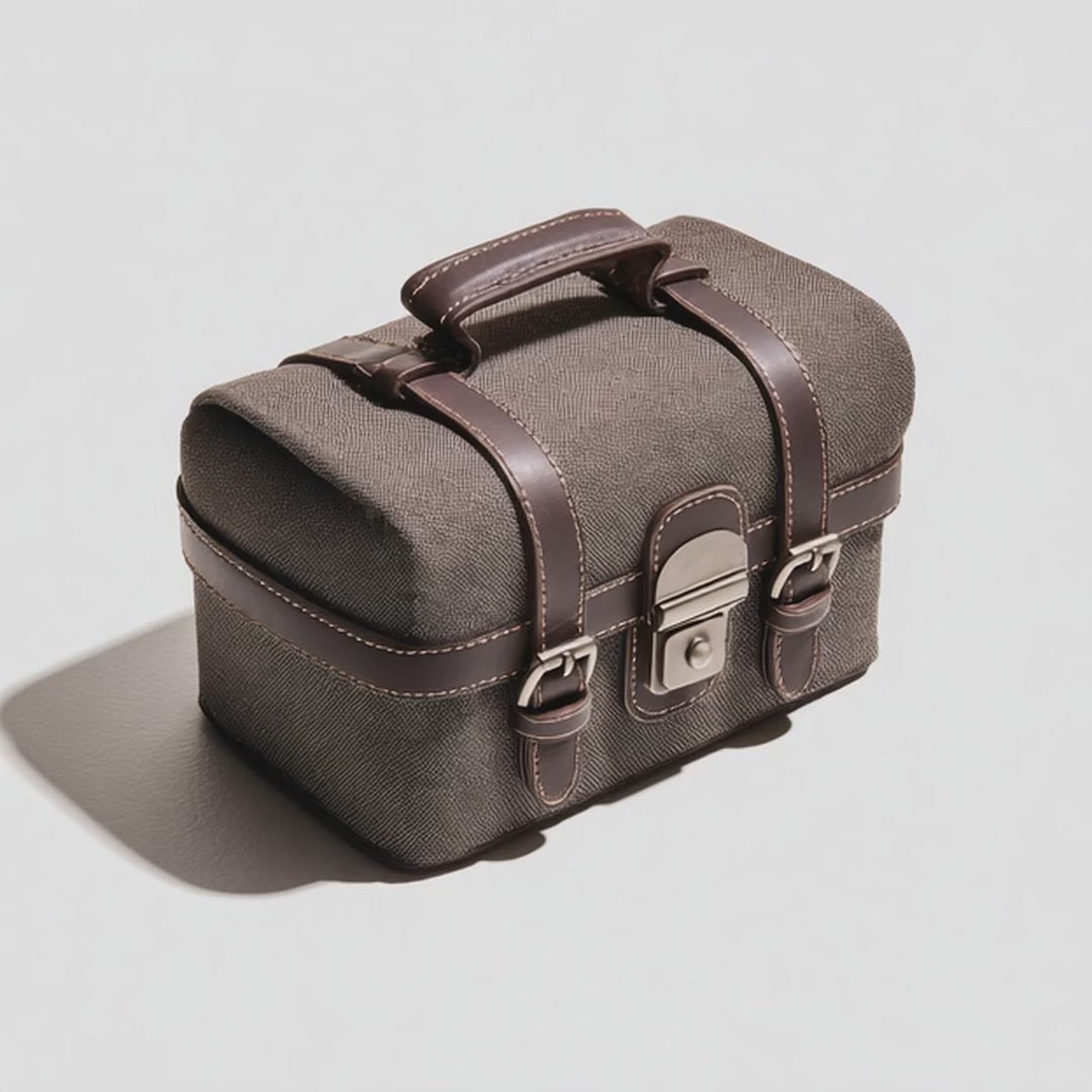 Featuring a structured frame, antique-brass hardware, and precision stitching, every detail is designed for endurance and sophistication. Inside, a soft-lined compartment offers padded protection for binoculars, cameras, or other delicate gear, while the top-handle design ensures effortless portability.